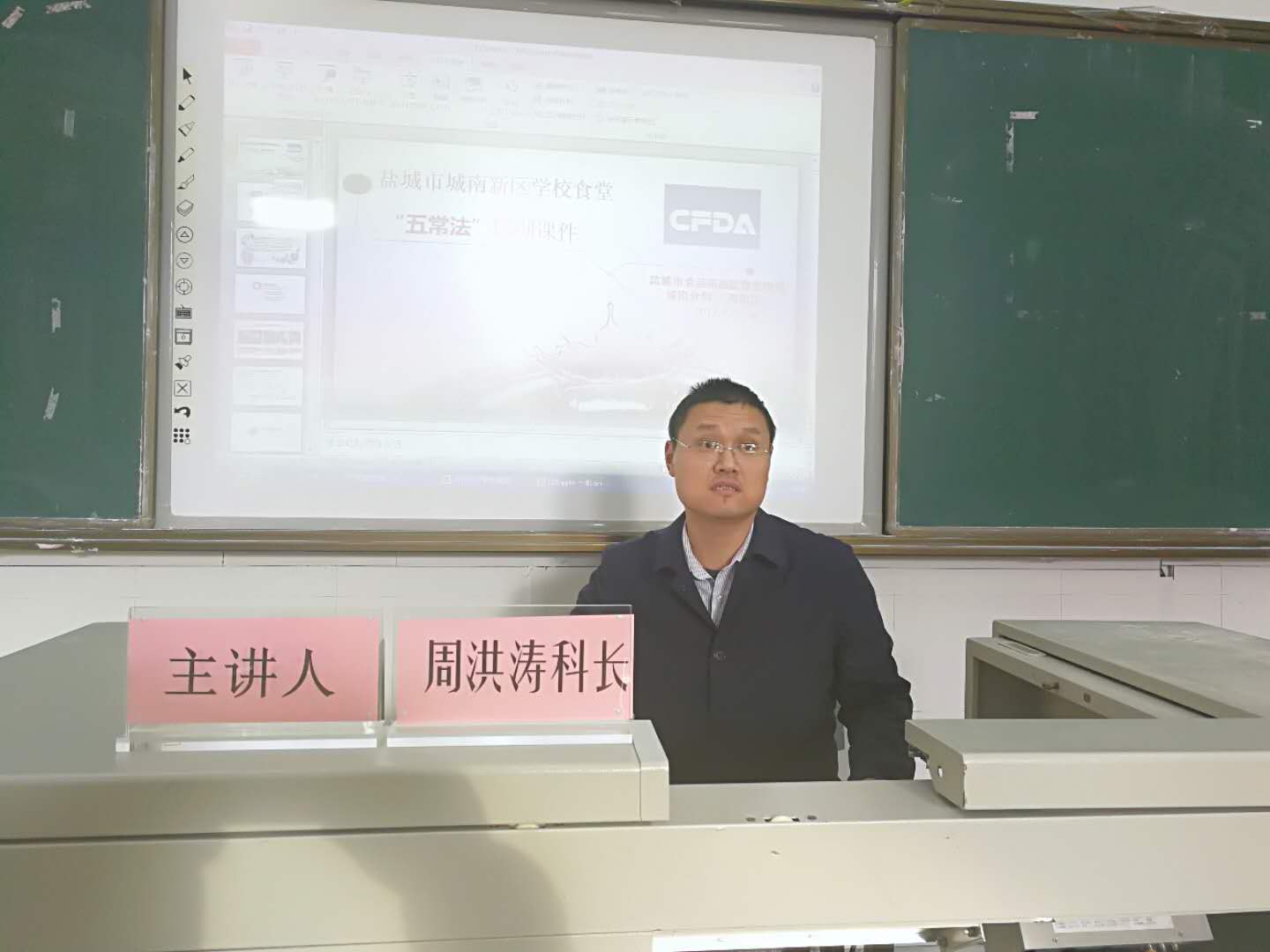 江苏省食品药品监督管理局于2016年12月编写《江苏省学校食堂五常管理实施指南》,核心就是“五常法”:常分类、常整理、常清洁、常检查、常自律。本次培训的主讲人是盐城市城南新区食品药品管理分局周洪涛科长。本次培训的目的就是要在我校食堂管理中普及“五常法”意识和做法,通过强化五常管理,逐步改变学校食堂食品从业人员不规范的生活习惯,进而养成规范的食品工作习惯,使我校食堂成为师生完全放心、完全信任的卫生、健康、安全的就餐场所。