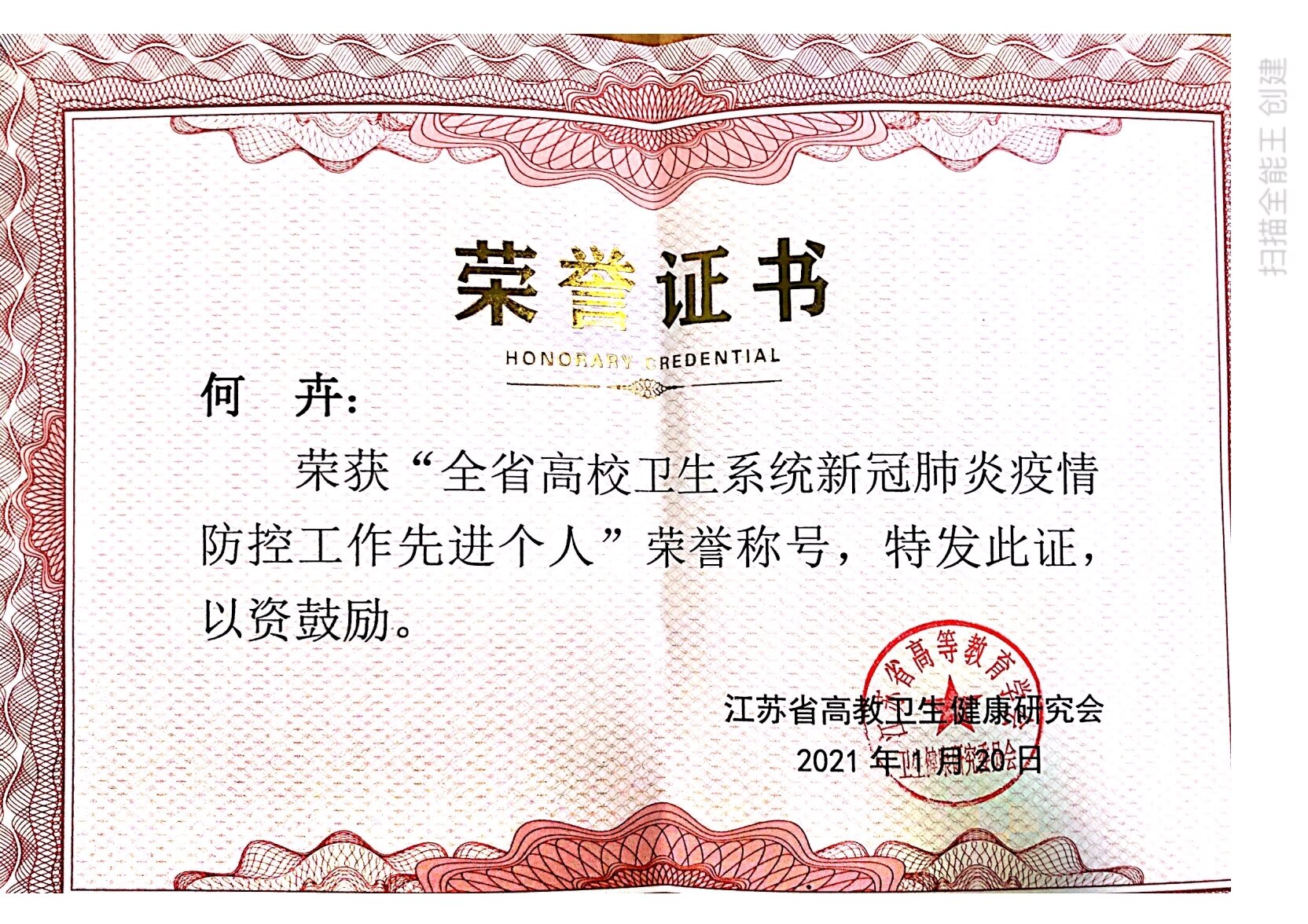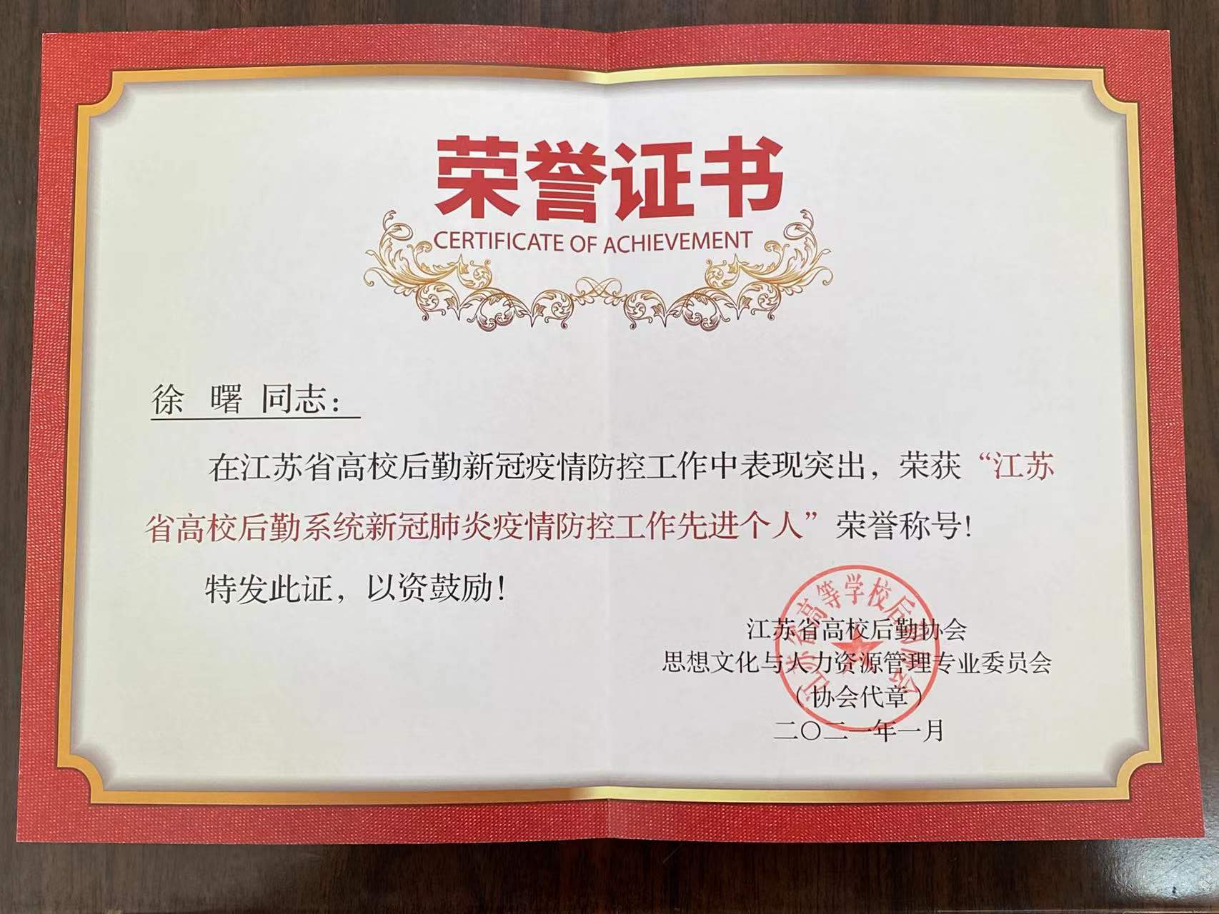 经过我校全体后勤人员共同努力,助力学校构建起有效的联防联控机制,充分展示了新时代高校后勤人的精神风貌、职业操守、意志品质和应急能力。因为我校后勤管理处在防疫工作中认真负责,2021年1月被江苏省高等学校后勤协会评为“江苏省高校后勤系统新冠肺炎疫情防控工作先进集体”,卫生所徐曙医生被评为“江苏省高校后勤系统新冠肺炎疫情防控工作先进个人”。卫生所何卉医生被江苏省高教卫生健康研究会评为“全省高校卫生系统新冠肺炎疫情防控工作先进个人”。